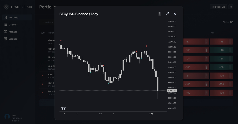 Traders Aid's Technical Analysis Tool includes a detailed performance charts, providing traders with in-depth visual analysis of their assets. This chart is essential for identifying trends, understanding market movements, and making informed trading decisions.