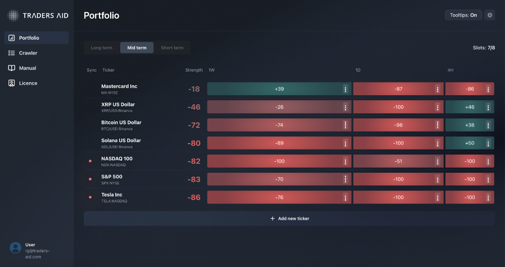 Welcome to Traders Aid's Portfolio Management dashboard. This intuitive interface is designed to provide traders with comprehensive insights into their financial assets, enabling informed decision-making for long-term, mid-term, and short-term investment strategies. Easily search for tickers, and seamlessly add or remove assets to customise your portfolio according to your specific trading needs.